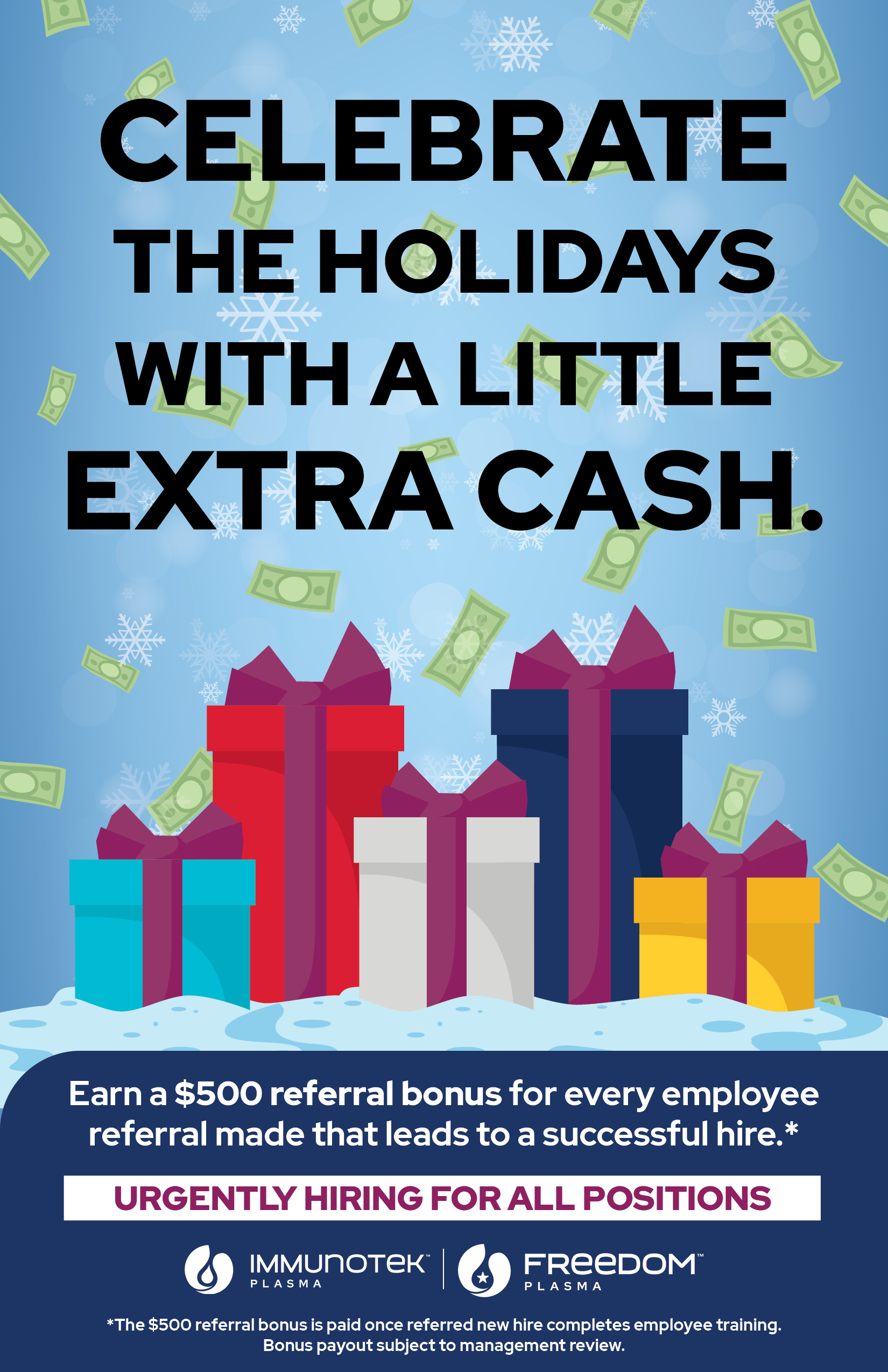 Project: Freelance client needed a quick, colorful holiday poster to promote their referral bonus program.